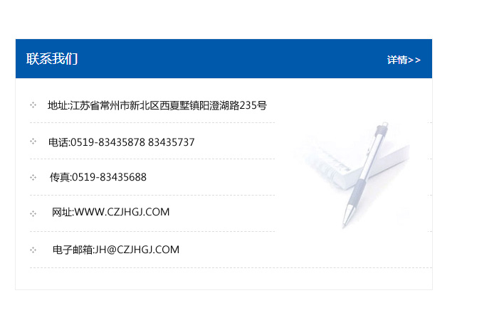 地址:常州市新北區友邦商務大廈1幢16、17層  電話:0519-85101652  傳真:0519-85112595  郵編:213022  網址:www_cz-jiayue_cn.shlkfs.com  郵箱:xiajifengaa@163.com
